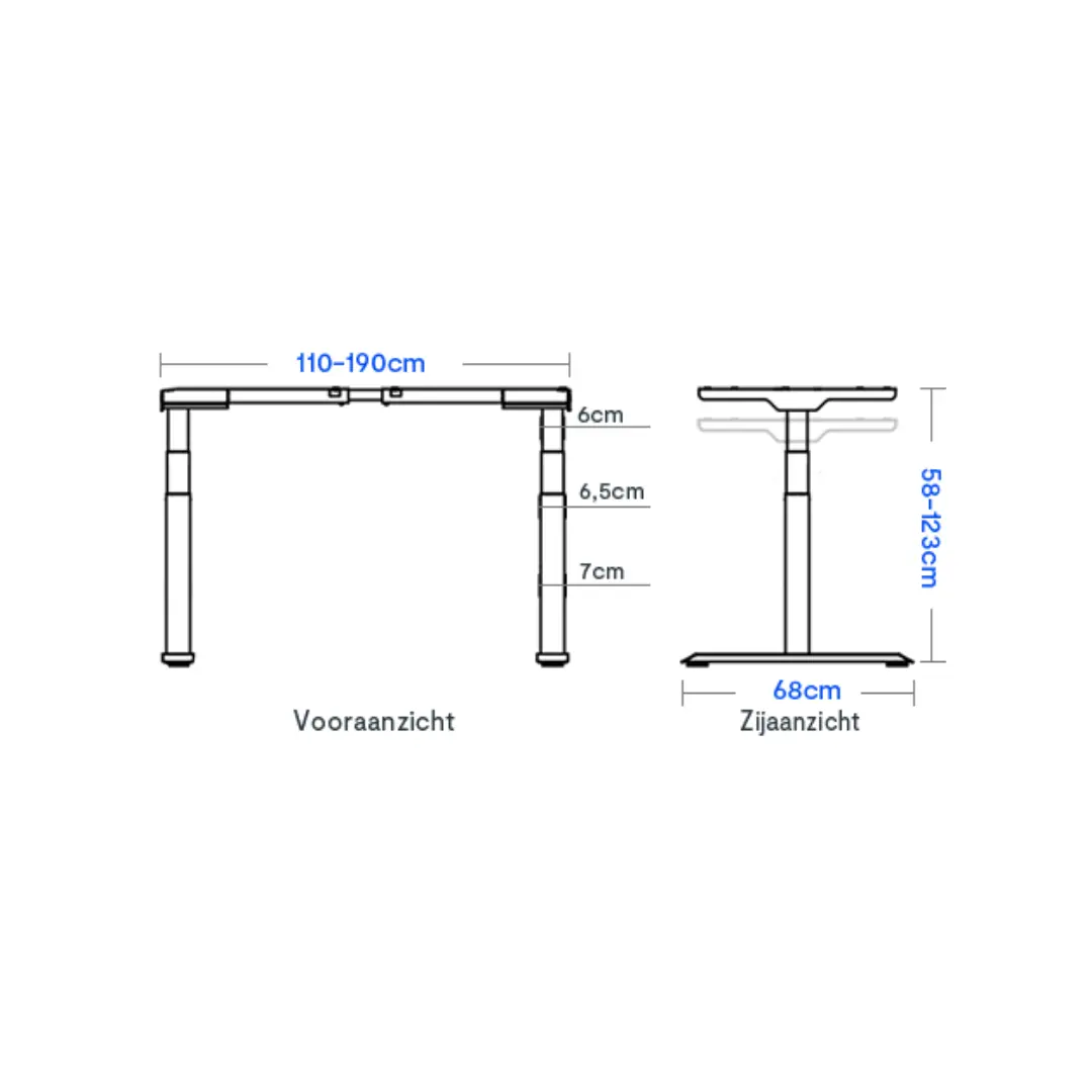 Met hoogtebereiken van 58–123 cm of 63–133 cm stel je het bureau precies af op jouw ideale werkhouding. Wisselen tussen zitten en staan gaat moeiteloos en voelt direct natuurlijk.